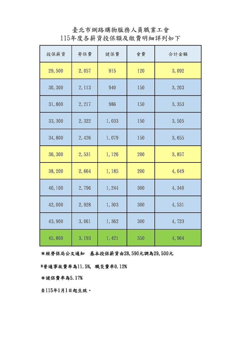 臺北市網路購物服務人員職業工會 -- 115年度各薪資投保額及繳費明細(含114年)